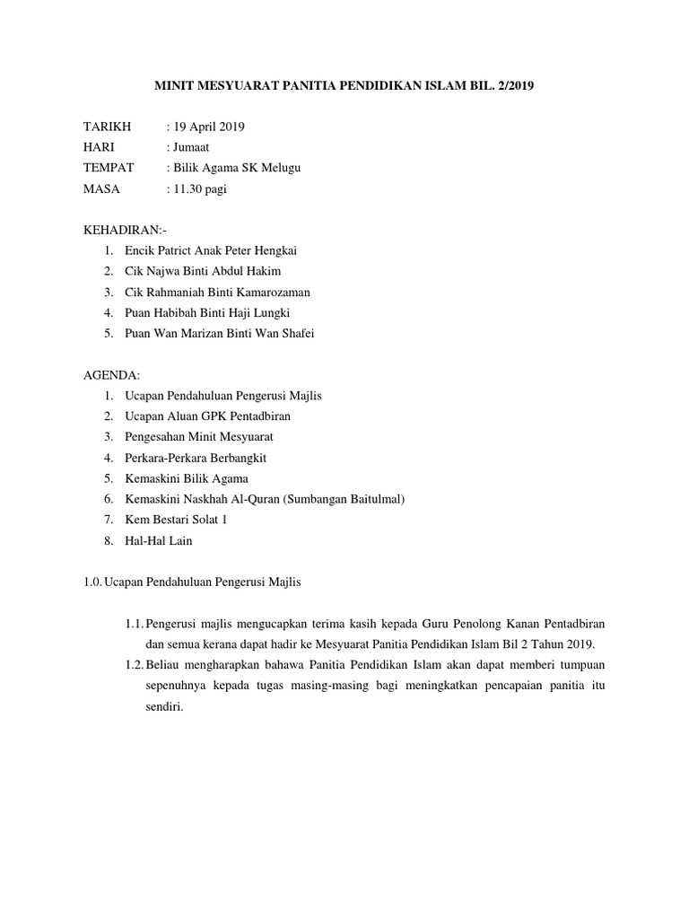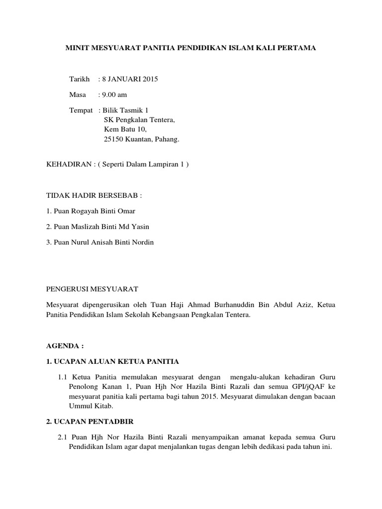 Savesave minit mesyuarat panitia pendidikan islam kali ke p. Jenis jenis contoh minit mesyuarat. Norhafizah bt ahmad zamri matematik / sains 3. Imam besar masjid negeri perak. Profil akademik sk merchong jaya.