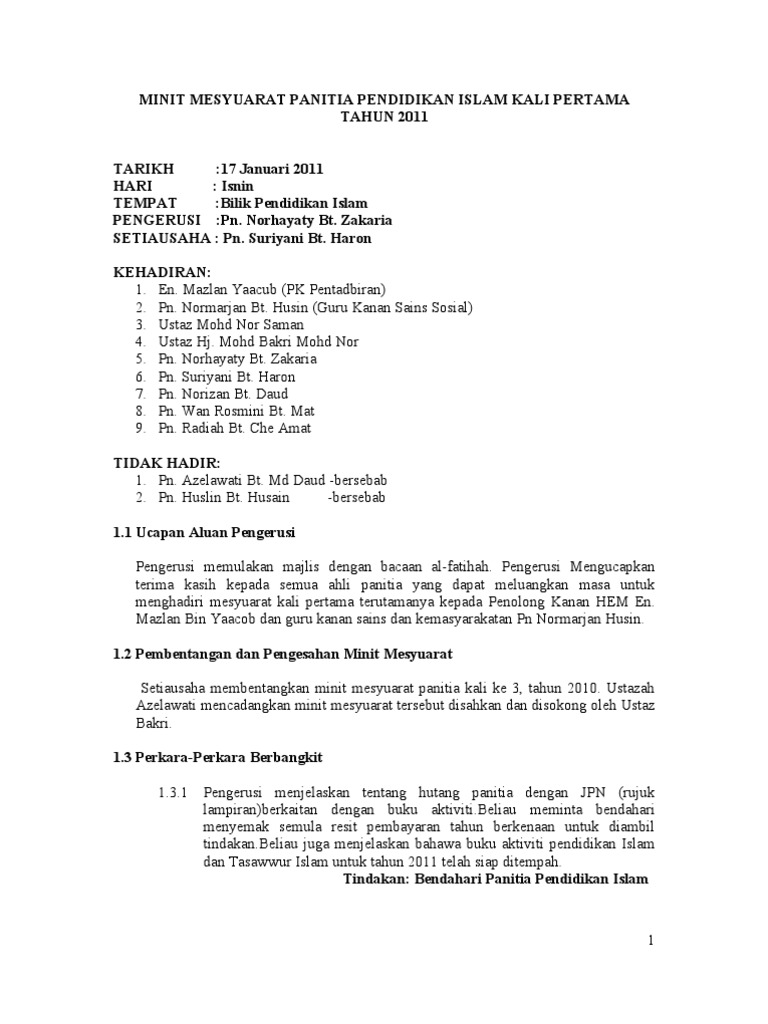 Minit Mesyuarat Panitia Pendidikan Islam / Bagi mencapai objektif sedemikian, kita seharusnya mempunyai sumber dan rangka yang pelbagai dalam sampel sampel minit mesyuarat berkenaan supaya ubah.
