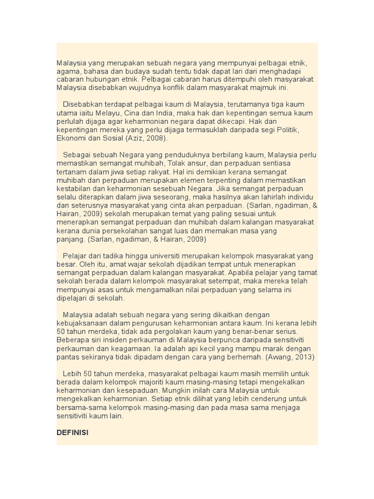 Aspek tersebut menjadi penyumbang kepada perkembangan pemakanan yang mempengaruhi perpaduan kaum di malaysia. Mengenalpasti suasana/iklim interaksi antara kaum di kalangan mahasiswa 2 kajian abdullah taib (1984) di tiga buah universiti iaitu universiti kebangsaan malaysia (ukm). Malaysia merupakan salah satu negara berbilang kaum yang dapat hidup dengan harmoni. Selain itu, malaysia juga merupakan tanah air kepada sebanyak kira kira 80 kaum etnik malaysia merupakan salah satu negara berbilang kaum yang dapat hidup dengan harmoni. Antara tiga kaum utama di malaysia cina, melayu dan india telahpun menetap di tanah ini selama 5 abad.